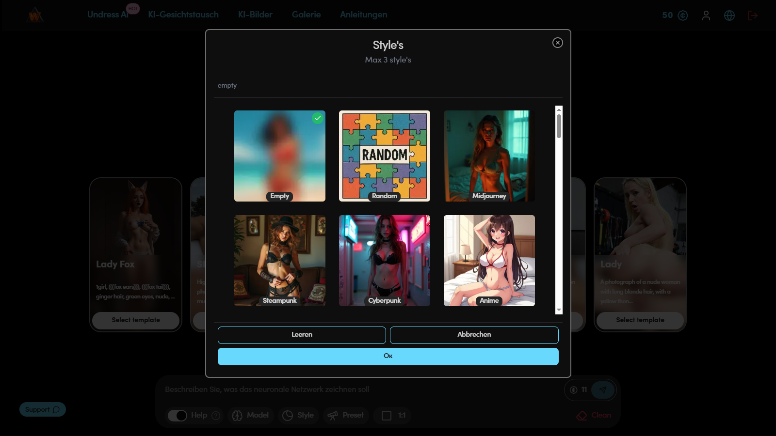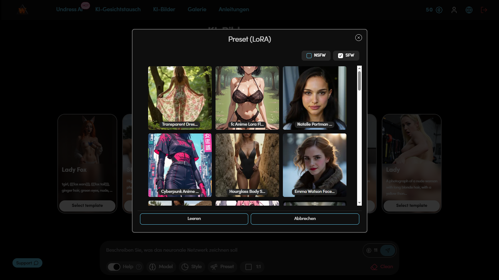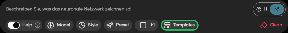 Vorlagen vereinfachen den Generierungsprozess, wenn Geschwindigkeit und Stabilität der Ergebnisse wichtig sind. Dies sind fertige Presets, in denen Modell, Stil und LoRA bereits konfiguriert sind.