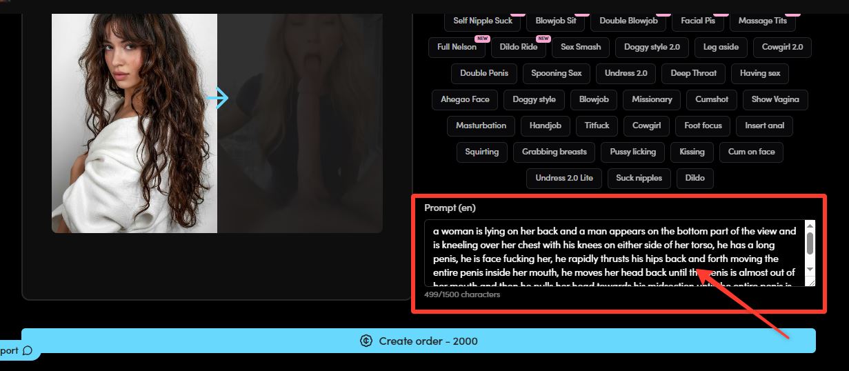 The phrases are added at the end — this is the simplest and most reliable way: they don't break the scene structure but immediately change the tone and visuals to match your desires (lipstick + facial + pleading eyes). This allows creating hundreds of variations of one scene: from romantic deepthroat with beautiful lipstick to hard brutal face fuck with ruined makeup and cum on face.