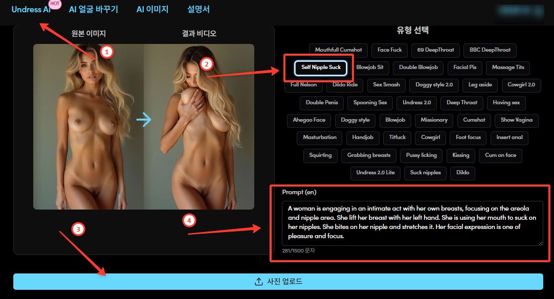 이 포즈들을 사용하면 영상이 깨끗하게 나온다: 입술이 젖꼭지에 자연스럽게 닿고, 가슴이 리얼하게 움직이며, “플라스틱” 아티팩트가 없다. 가장 중요한 것은 사진이 액션 직전의 “얼어붙은 순간”이어야 한다는 점, “중립적인 초상화”가 아니라는 점이다. 그러면 5초 애니메이션도 진짜 포르노처럼 보인다.